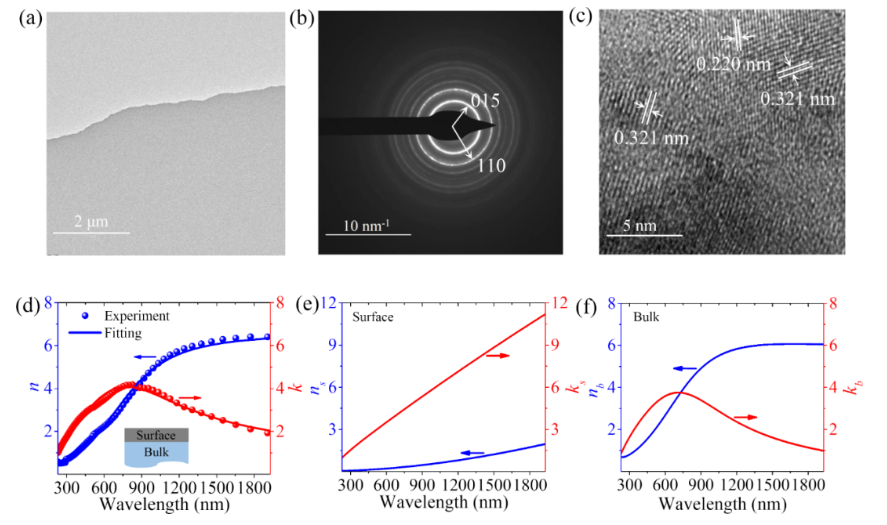 The bismuth telluride material was characterized by transmission electron microscopy and ellipsometry. FIG. 2a-2c shows transmission electron micrographs (high-resolution images) and selected electron diffraction patterns of bismuth telluride nanofilms. It can be seen from the figure that the prepared bismuth telluride nanofilms are polycrystalline materials, and the main growth orientation is (015) crystal plane. Figure 2d-2f shows the complex refractive index of bismuth telluride measured by ellipsometer and the fitted surface state and state complex refractive index. The results show that the extinction coefficient of the surface state is greater than the refractive index in the range of 230~1930 nm, showing metal-like characteristics. The refractive index of the body is more than 6 when the wavelength is greater than 1385 nm, which is much higher than that of silicon, germanium and other traditional high-refractive index materials in this band, which lays a foundation for the preparation of ultra-thin optical resonators. The researchers point out that this is the first reported realization of a topological insulator planar optical cavity with a thickness of only tens of nanometers in the optical communication band. Subsequently, the absorption spectrum and resonance wavelength of the ultra-thin optical cavity were measured with the thickness of bismuth telluride. Finally, the effect of silver film thickness on electromagnetically induced transparency spectra in bismuth telluride nanocavity/photonic crystal structures is investigated