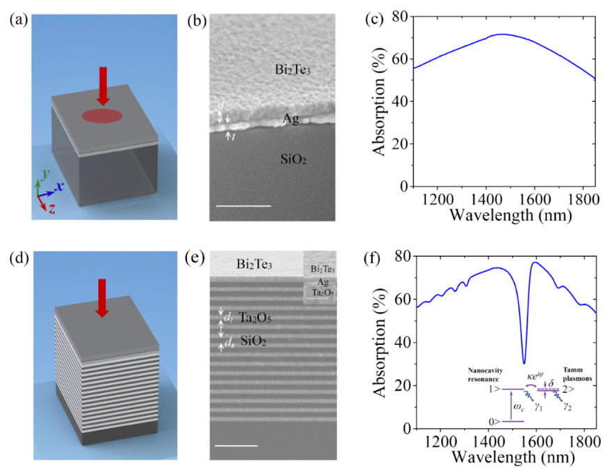 As shown in FIG. 1a and 1b, the optical resonator is mainly composed of a bismuth telluride topological insulator and silver nanofilms. The bismuth telluride nanofilms prepared by magnetron sputtering have large area and good flatness. When the thickness of the bismuth telluride and silver films is 42 nm and 30 nm, respectively, the optical cavity exhibits strong resonance absorption in the band of 1100~1800 nm (Figure 1c). When the researchers integrated this optical cavity onto a photonic crystal made of alternating stacks of Ta2O5 (182 nm) and SiO2 (260 nm) layers (Figure 1e), a distinct absorption valley (Figure 1f) appeared near the original resonant absorption peak (~1550 nm), which is similar to the electromagnetically induced transparency effect produced by atomic systems.
