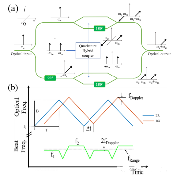 As we all know, one of the most important components in FMCW-based Lidar systems is the high linearity modulator. Its working principle is shown in the following figure: Using DP-IQ modulator based single sideband modulation (SSB), the upper and lower MZM work at null point, on the road and down the side band of wc+wm and WC-WM, wm is the modulation frequency, but at the same time the lower channel introduces 90 degrees phase difference, and finally the light of WC-WM is cancelled, only the frequency shift term of wc+wm. In Figure b, LR blue is the local FM chirp signal, RX orange is the reflected signal, and due to the Doppler effect, the final beat signal produces f1 and f2.