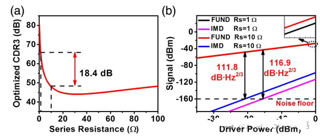 The above is equivalent to considering C in the RC model of MZM, and the influence of R should also be considered. The following is the change curve of CDR3 with the series resistance. It can be seen that the smaller the series resistance, the larger the CDR3.
