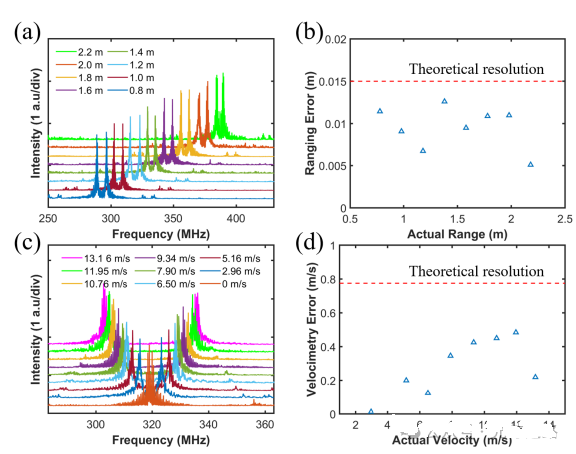 In the following figure, the test results of the Lidar system show that a/b is the beat signal at the same speed and at different distances, and c/d is the beat signal at the same distance and at different speeds. The test results reached 15mm and 0.775m /s.