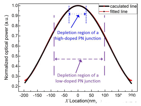 One of the reasons for the non-linearity of modulation phase with voltage is that the light field in the waveguide is in different distribution of heavy and light parameters and the phase change rate is different with the change of voltage. As shown in the following picture. The depletion region with heavy interference changes less than that with light interference.