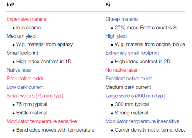 Figure 1 shows a comparison of two material systems, indium Phosphorus (InP) and silicon (Si). The rarity of indium makes InP a more expensive material than Si. Because silicon-based circuits involve less epitaxial growth, the yield of silicon-based circuits is usually higher than that of InP circuits. In silicon-based circuits, germanium (Ge), which is usually only used in Photodetector (light detectors), requires epitaxial growth, while in InP systems, even passive waveguides must be prepared by epitaxial growth. Epitaxial growth tends to have a higher defect density than single crystal growth, such as from a crystal ingot. InP waveguides have high refractive index contrast only in transverse, while silicon-based waveguides have high refractive index contrast in both transverse and longitudinal, which allows silicon-based devices to achieve smaller bending radii and other more compact structures. InGaAsP has a direct band gap, while Si and Ge do not. As a result, InP material systems are superior in terms of laser efficiency. The intrinsic oxides of InP systems are not as stable and robust as the intrinsic oxides of Si, silicon dioxide (SiO2). Silicon is a stronger material than InP, allowing the use of larger wafer sizes, i.e. from 300 mm (soon to be upgraded to 450 mm) compared to 75 mm in InP. InP modulators usually depend on the quantum-confined Stark effect, which is temperature-sensitive due to band edge movement caused by temperature. In contrast, the temperature dependence of silicon-based modulators is very small.