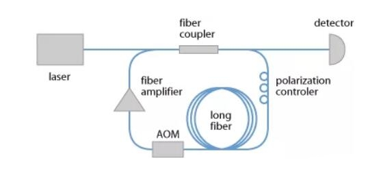 The basic reason for using fiber loops is that a medium length fiber can provide a long time delay because light travels many turns in the fiber. In order to separate the light transmitted in different loops, an acousto-optic modulator can be used in the loop to produce a certain frequency shift (for example, 100MHz). Because this frequency shift is much larger than the line width, light that has traveled a different number of turns in the loop can be separated in the frequency domain. In the photodetector, the original laser light and the beat of the light after the frequency shift can be used to measure the line width.