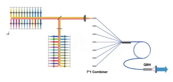 Beam shaping using the same or close wavelength of the laser unit is the basis of multiple laser beam combination of different wavelengths. Among them, spatial beam bonding is to stack multiple laser beams in space to increase power, but may cause the beam quality to decrease. By using the linear polarization characteristic of semiconductor laser, the power of two beams whose vibration direction is perpendicular to each other can be increased by nearly twice, while the beam quality remains unchanged. Fiber bundler is a fiber device prepared on the basis of Taper Fused Fiber Bundle (TFB). It is to strip a bundle of optical fiber coating layer, and then arranged together in a certain way, heated at high temperature to melt it, while stretching the optical fiber bundle in the opposite direction, the optical fiber heating area melts into a fused cone optical fiber bundle. After cutting off the cone waist, fuse the cone output end with an output fiber. Fiber bunching technology can combine multiple individual fiber bundles into a large-diameter bundle, thus achieving higher optical power transmission. Figure 1 is the schematic diagram of blue laser fiber technology.