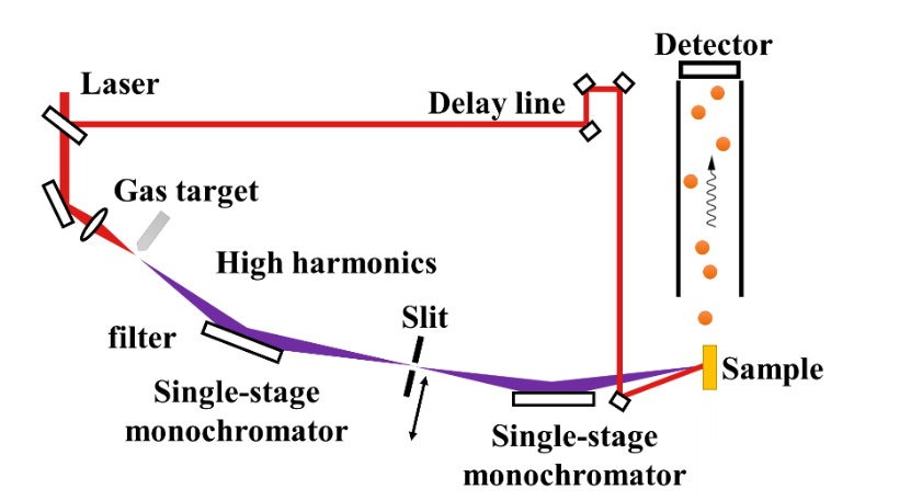 For Tr-ARPES applications, reducing the wavelength of driving light and increasing the probability of gas ionization are effective means to obtain high flux and high order harmonics. In the process of generating high-order harmonics with single-pass high-repetition frequency, the frequency doubling or triple doubling method is basically adopted to increase the production efficiency of high-order harmonics. With the help of post-pulse compression, it is easier to achieve the peak power density required for high order harmonic generation by using a shorter pulse drive light, so higher production efficiency can be obtained than that of a longer pulse drive.