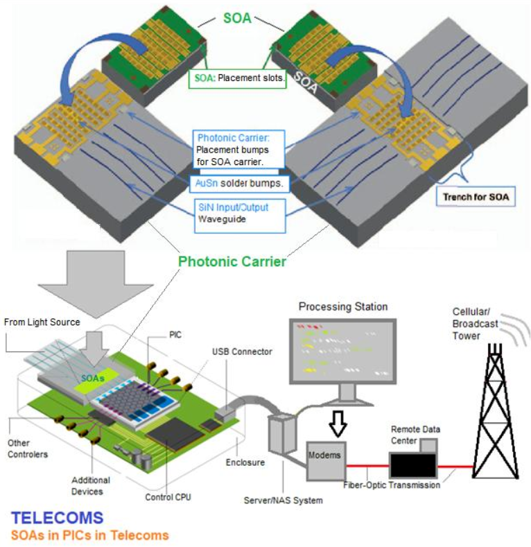 After the advent of the era of large-capacity optical fiber communication, optical amplification technology has developed rapidly. Optical amplifiers amplify input optical signals based on stimulated radiation or stimulated scattering. According to the working principle, optical amplifiers can be divided into semiconductor optical amplifiers (SOA) and optical fiber amplifiers. Among them, semiconductor optical amplifiers are widely used in optical communication by virtue of the advantages of wide gain band, good integration and wide wavelength range. They are composed of active and passive regions, and the active region is the gain region. When the light signal passes through the active region, it causes the electrons to lose energy and return to the ground state in the form of photons, which have the same wavelength as the light signal, thus amplifying the light signal. The semiconductor optical amplifier converts the semiconductor carrier into the reverse particle by the driving current, amplifies the injected seed light amplitude, and maintains the basic physical characteristics of the injected seed light such as polarization, line width and frequency. With the increase of the working current, the output optical power also increases in a certain functional relationship.