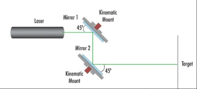 Figure 1 shows the basic setup of the Z-Fold structure and shows the reason behind the name. The two mirrors mounted on two kinematic mounts are used for angular displacement and are positioned so that the incident light beam hits the mirror surface of each mirror at the same Angle. To simplify the setup, place the two mirrors at about 45°. In this setup, the first kinematic support is used to obtain the desired vertical and horizontal position of the beam, while the second support is used to compensate for the Angle. The Z-Fold structure is the preferred method for aiming multiple laser beams at the same target. When combining lasers with different wavelengths, one or more mirrors may need to be replaced with dichroic filters.