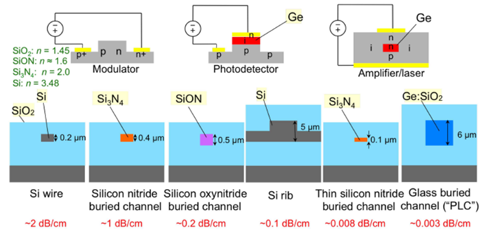 There are many possible forms of silicon-based optical waveguides, as shown in Figure 2. They range from microscale germanium-doped silica waveguides to nanoscale Silicon Wire waveguides. By blending germanium, it is possible to make photodetectors and electrical absorption modulators, and possibly even optical amplifiers. By doping silicon, an optical modulator can be made. The bottom from left to right are: silicon wire waveguide, silicon nitride waveguide, silicon oxynitride waveguide, thick silicon ridge waveguide, thin silicon nitride waveguide and doped silicon waveguide. At the top, from left to right, are depletion modulators, germanium photodetectors, and germanium optical amplifiers.