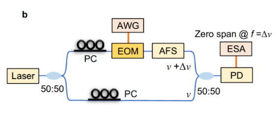 To verify the modulation capability of the electro-optic modulator, the team first demonstrated the variation of the transmittance of the device with the DC voltage at the operating wavelength. It can be seen that after 1 V, the transmittance drops sharply over 60 dB. Due to the limitation of conventional oscilloscope observation methods, the research team adopts the self-heterodyne interference measurement method, and uses the large dynamic range of the spectrometer to characterize the ultra-high dynamic extinction ratio of the modulator during pulse modulation. The experimental results show that the output light pulse of the modulator has an extinction ratio of up to 68 dB, and the extinction ratio of more than 65 dB near several resonant wavelength positions. After detailed calculation, the actual RF drive voltage loaded to the electrode is about 1 V, and the modulation power consumption is only 3.6 mW, which is two orders of magnitude smaller than the conventional AOM modulator power consumption.