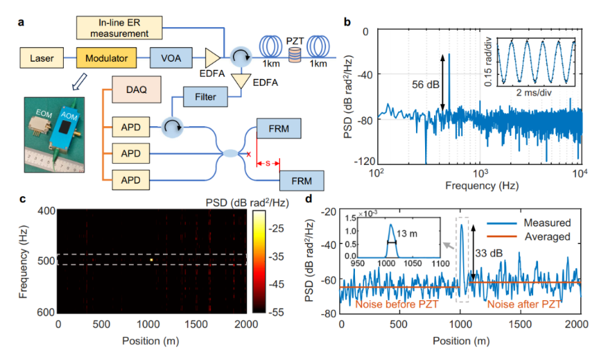 This study is the first to achieve an electro-optical modulator on silicon with an ultra-high extinction ratio (68 dB), and successfully applied to DAS systems, and the effect of using commercial AOM modulator is very close, and the size and power consumption are two orders of magnitude smaller than the latter, which is expected to play a key role in the next generation of miniaturized, low-power distributed fiber sensing systems. In addition, the CMOS large-scale manufacturing process and on-chip integration capability of silicon-based optoelectronic devices can greatly promote the development of a new generation of low-cost, multi-device monolithic integrated modules based on-chip distributed fiber sensing systems.