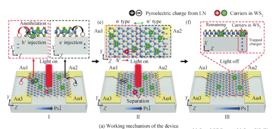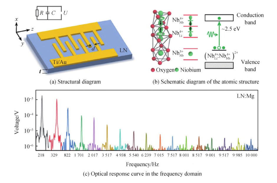 Figure 1, using the defect energy states within the LN bandgap as electron donor centers, free charge carriers are generated in the conduction band under visible light excitation. Compared to previous pyroelectric LN photodetectors, which were typically limited to a response speed of around 100Hz, this LN photodetector has a faster response speed of up to 10kHz. Meanwhile, in this work, it was demonstrated that magnesium ion doped LN can achieve external light modulation with a response of up to 10kHz. This work promotes the research on high-performance and high-speed LN photodetectors in the construction of fully functional single-chip integrated LN photonic chips.