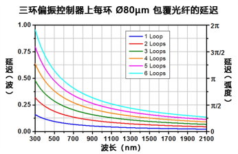 The above figure shows the test results of the three ring polarization controller on Ø 80 µm and Ø 125 µm coated optical fibers, with a controller loop diameter of 56mm. A larger ring diameter is very suitable for optical fibers with high bending losses.